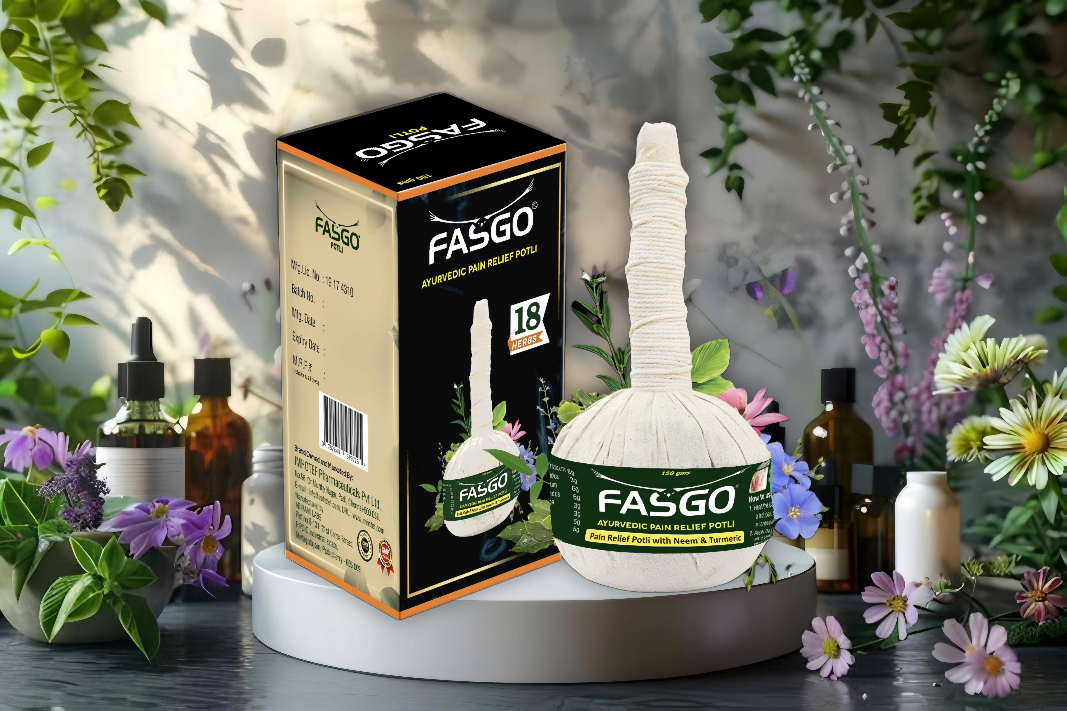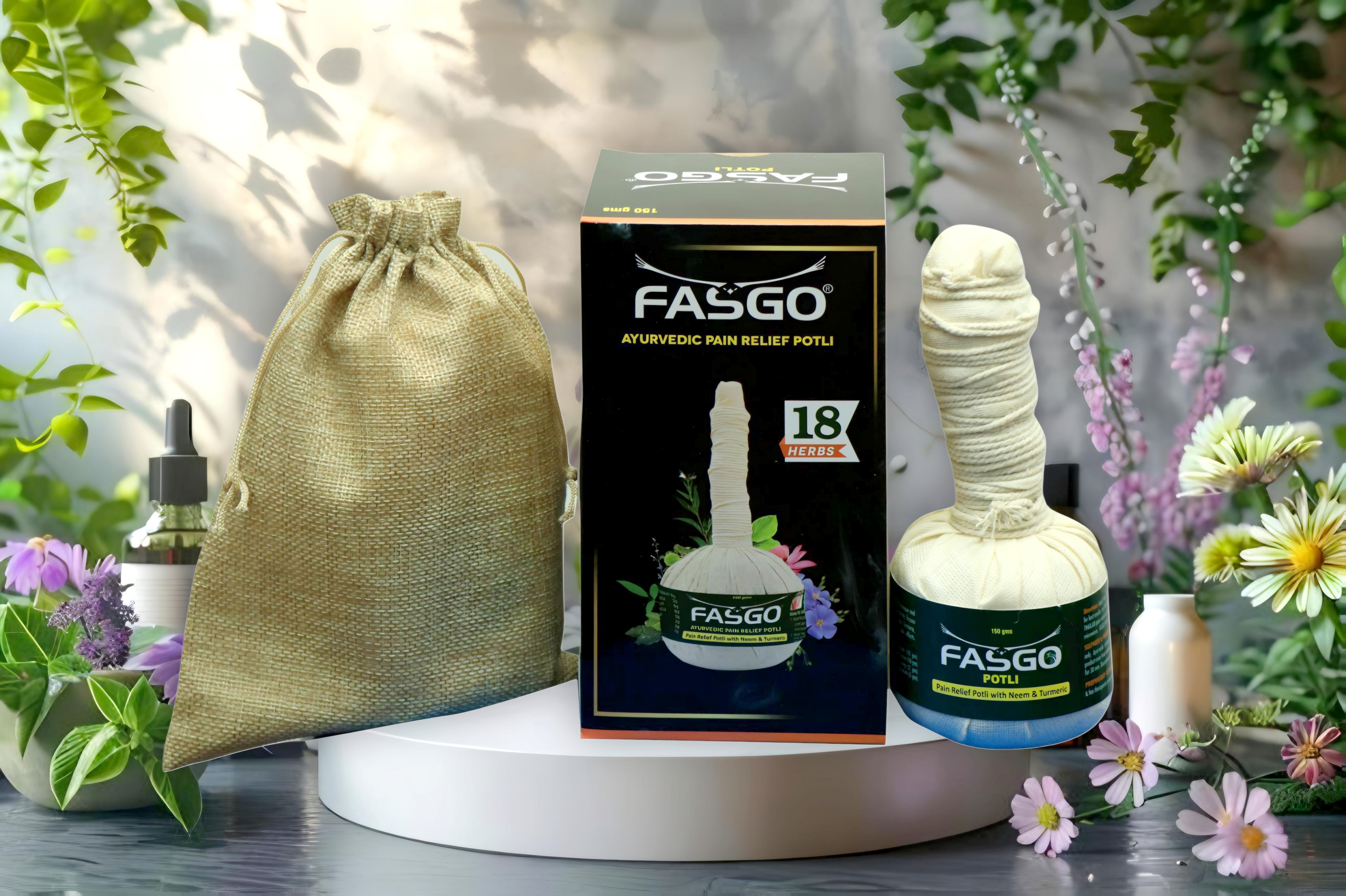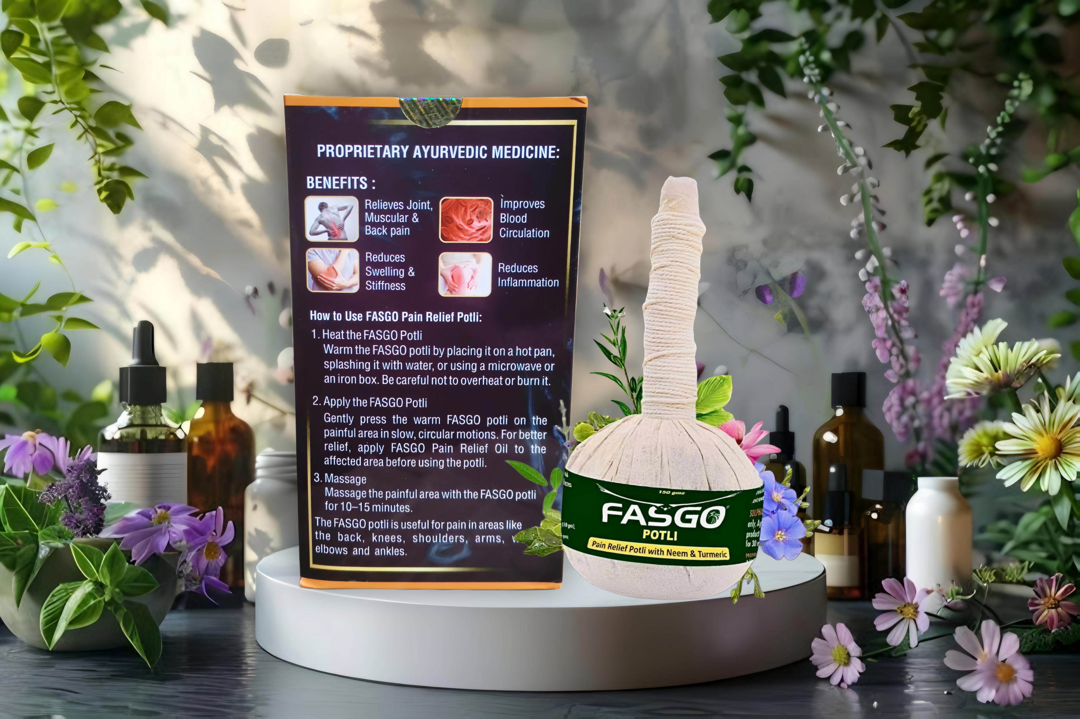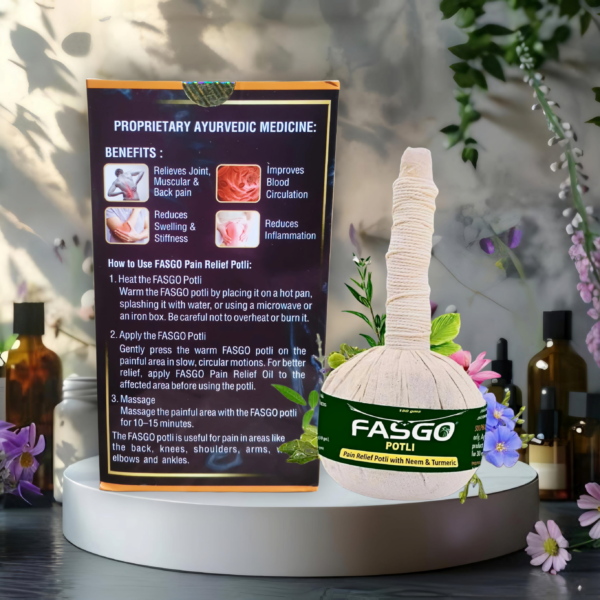 आयुर्वेदिक पोटली का उपयोग पीठ और जोड़ों के दर्द, जैसे की गठिया, फ्रोजन शोल्डर, और स्पॉन्डाइलाइटिस जैसी समस्याओं के राहत के लिए किया जा सकता है। इसमें हल्दी, नीम, आदि जैसे सोलह आयुर्वेदिक जड़ी-बूटियाँ हैं, जो बिना किसी साइड इफेक्ट के उपयोगकर्ता को उनके उपचारीय गुण प्रदान करती हैं।